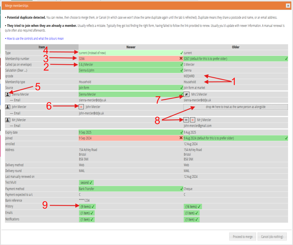 With those changes, we can click the proceed to merge button. You won’t need to enrol, as they were already members: we are left with a current membership after the merge.