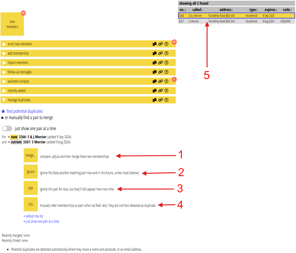 If you want to merge a pair that we did not detect automatically (such as the “moving in together” example above), just look the two memberships up manually (Fig 2: 5). For example, enter the two membership numbers or email addresses in the main search box. If you need to use other search tools to find them, you can save them using the filter icon in the main search box, and restore them after manage duplicates has done its automatic search.